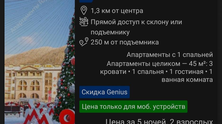 И вот вам пример курорта Горки Город. Booking через сайт даёт цену в 68000 ₽ на 5 ночей. Через приложение - уже 49000 ₽.